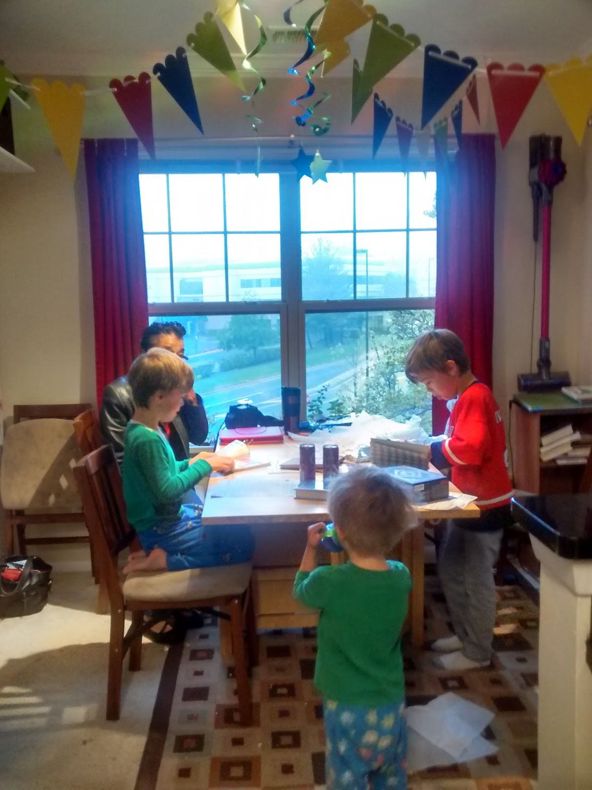 After school we met them with a frizzbee and candy from Grandma and Papa. We played with the frizzbee at the playground. When we got home I gave the boys my birthday poems, which I've been writing for them almost every year since they were born. They were unimpressed and pretended not to like them. I think one day they will. They opened another gift and card, I made them a smoothie, and they headed to hockey practice.